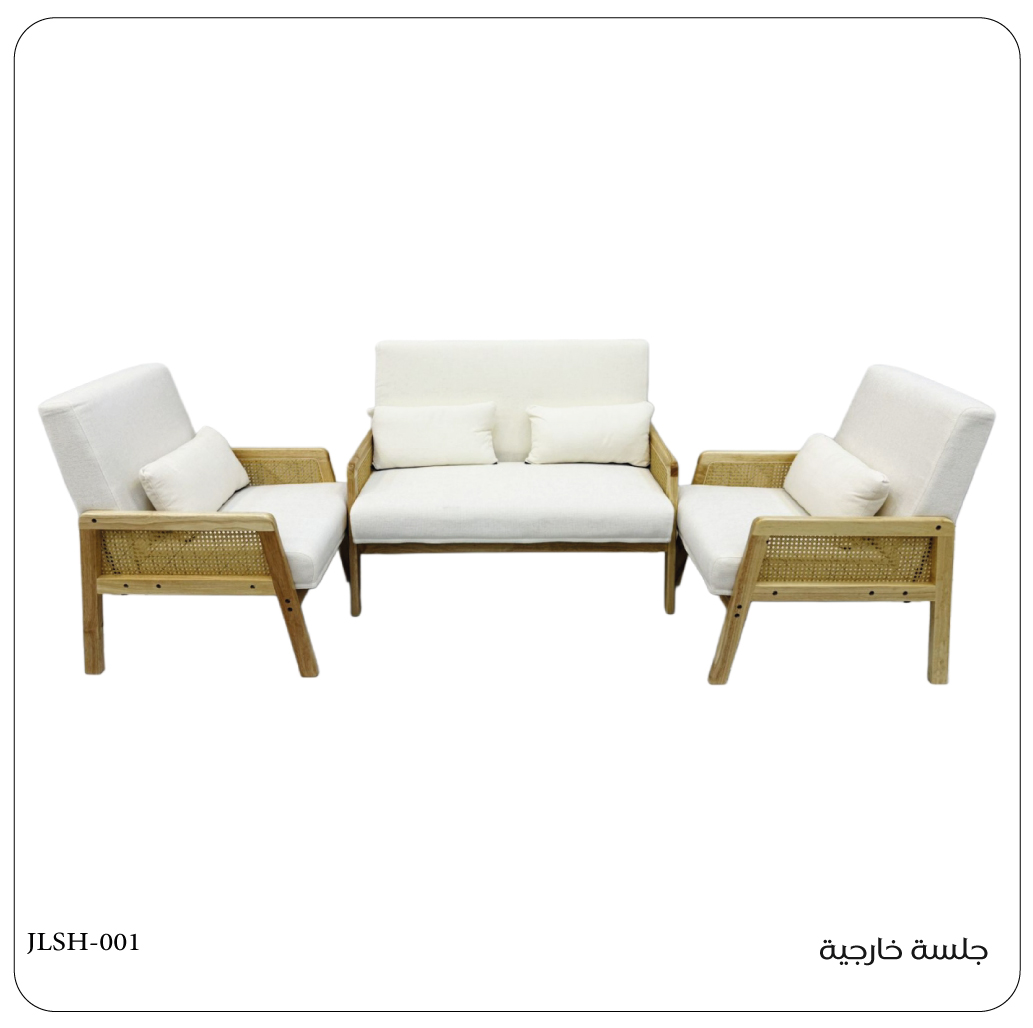 جلسة خارجية عصرية من الخشب والراتان مع وسائد قماشية تجمع بين التصميم الأنيق والمتانة لتوفر لك تجربة جلوس مريحة في الهواء الطلق. تتميز بمقاعد واسعة مع وسائد قطنية مريحة باللون الأبيض، ما يجعلها مثالية للحدائق، الشرفات أو الاستراحات. تضفي خامة الراتان الطبيعية لمسة دافئة متناسقة مع الخشب، لتجعلها قطعة ديكور أنيقة تكمل المساحات الخارجية.